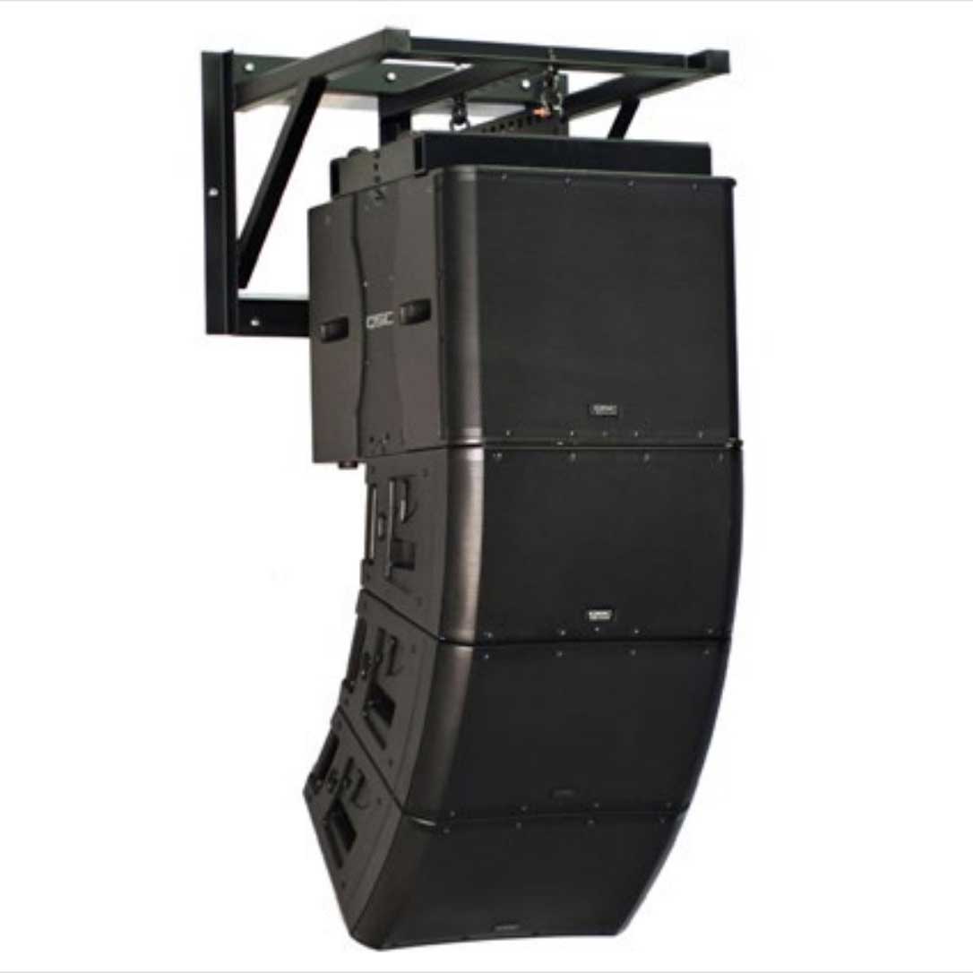 When rigging line arrays overhead is not practical, use the SAS-750-WM Steerables Line Array Wall Mount to install and aim line arrays up to 28” wide on either side of a stage or building. Line Arrays suspend from their own top grid or it’s rigging points, which allow for the desired tilt angle. Pan angles, up to 90 degrees left or right are achieved by way of an upper cross arm that aims the line array into the desired direction.