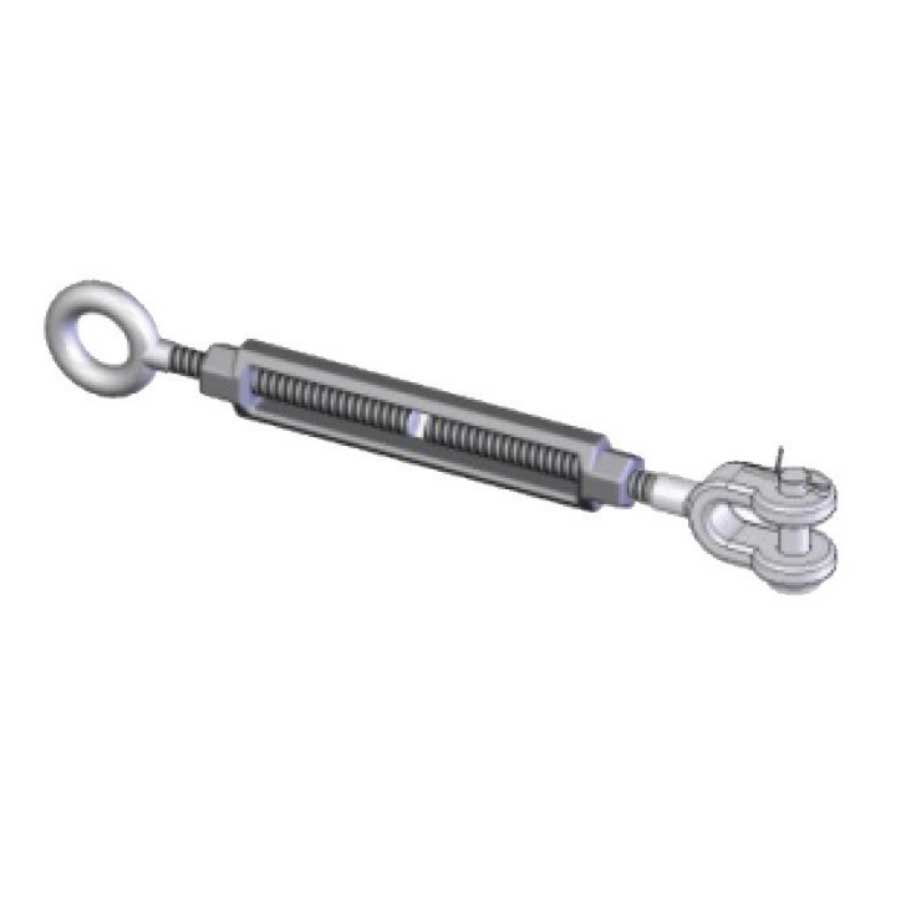 Turnbuckles serve as a load-rated tensioning and leveling device. For tensioning, one end always comes with a reversed thread so that when it is placed into service between two objects in its fully extended position, the housing may be rotated back to shorten the overall component, pulling the threaded arms in and putting additional tension into the system, such as between two anchored wire rope assemblies. Turnbuckles are also employed as leveling devices to bring overhead truss and grids into a level attitude. Its eye fittings accommodate shackles, quick links, etc.